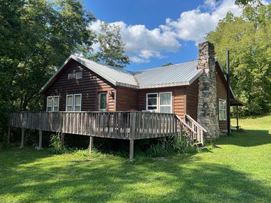 A two bedroom one bathroom cabin with a screened-in back porch.