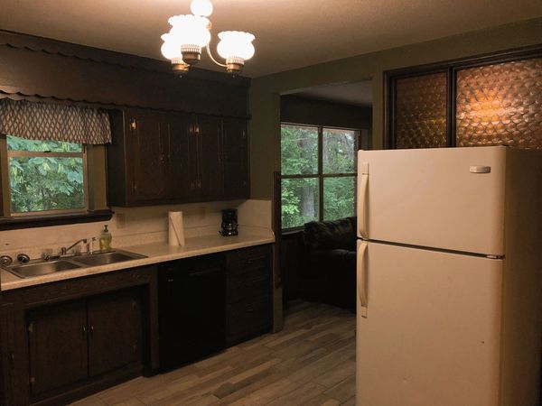 This vacation rental comes fully furnished and sleeps up to 10 people. It has two bedrooms with two queen sized beds, and another with one king sized bed. The house has two bathrooms, one with a shower tub combo, the other has a shower. There is a full kitchen including microwave, cook top, fridge and freezer. Outside there is a large patio with a gas grill and picnic tables. Guest check in at Wayside Campground to sign in and receive the key code.